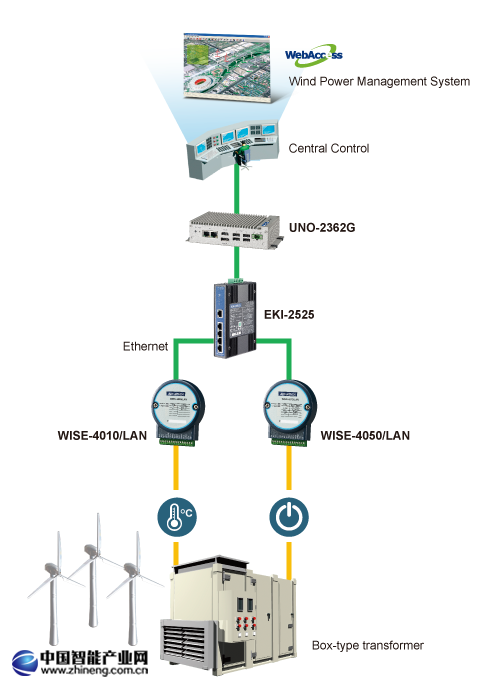 通過嵌入式無風扇工業(yè)電腦UNO-2362G、非網(wǎng)管型工業(yè)以太網(wǎng)交換機EKI-2525以及兩款物聯(lián)網(wǎng)以太網(wǎng)I/O模塊WISE-4010/LAN與WISE-4050/LAN,研華解決方案即能將現(xiàn)場各種裝置的信號與數(shù)據(jù)上傳至中心監(jiān)控室內(nèi)的風場監(jiān)控系統(tǒng)。其中,可支持Windows CE、Windows XPE、Embedded Linux等多種開放式操作系統(tǒng)的UNO-2362G能以更好的兼容性來取代原有的RTU;而提供高速以太網(wǎng)絡傳輸?shù)腅KI-2525所形成的局域網(wǎng)絡(LAN)則負責串連現(xiàn)場所有的硬件裝置,并藉此讓風力發(fā)電機成為可被監(jiān)控的聯(lián)網(wǎng)設備。