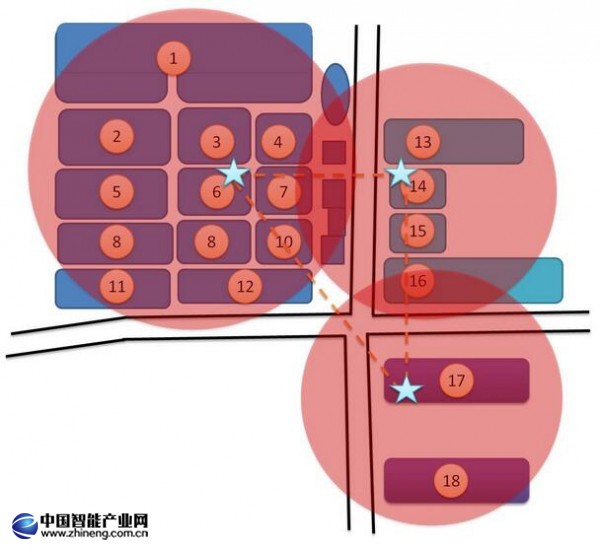 1、上圖中6號、14號、17號廠房的“★”代表三射頻工業(yè)無線AP EKI-6340-3。(詳細資料見附帶產(chǎn)品資料)