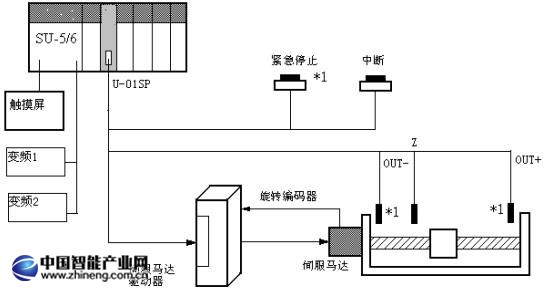根據(jù)上述控制要求,PLC選擇光洋電子的SU系列,變頻器和交流伺服選擇安川的產(chǎn)品,觸摸屏選用光洋電子的GC-55EM2,共同組成磨削自動控制系統(tǒng)。選擇光洋PLC主要是因為其中的U-01SP單軸伺服控制模塊可以與交流伺服驅(qū)動系統(tǒng)良好的配合,達到優(yōu)良的高、低速性能,而且伺服電機的編碼器信號直接反饋到該模塊,測抓反饋的中斷控制信號也直接反饋到該模塊,從而構(gòu)成真正意義上的閉環(huán)控制。該模塊在光洋精工已經(jīng)得到長期應(yīng)用。安川的交流伺服剛性好,技術(shù)先進、質(zhì)量穩(wěn)定,用于軸承加工設(shè)備非常合適;其變頻器具備MODBUS總線,由于光洋電子的SU系列CPU模塊的通訊口已經(jīng)內(nèi)置MODBUS協(xié)議,所以可以采用通訊方式控制多臺變頻,相比原先類似系統(tǒng)采用的模擬量輸出控制簡化了PLC硬件配置從而大幅節(jié)約了成本。值得一提的是SU-5M通訊功能強大,CPU自身具備3個通訊口,分別用于觸摸屏通訊、變頻器通訊、總線控制,而不需要單獨的通訊模塊,對提高配置的性價比起到了十分關(guān)鍵的作用。