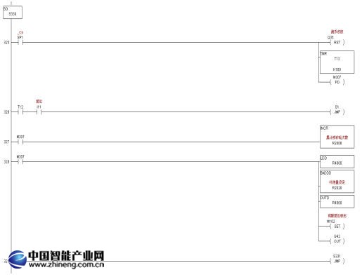 程序控制分為兩部分,CPU內(nèi)的主程序為傳統(tǒng)的PLC梯形圖程序,該程序采用光洋的級式語言編程,依據(jù)工藝流程圖編寫,結(jié)構(gòu)明晰、調(diào)試方便;U-01SP內(nèi)下載伺服控制程序,整個磨削過程及砂輪修正程序均包含在G代碼伺服程序內(nèi)。當PLC主程序需要調(diào)用伺服程序時,只需要控制U-01SP的對應(yīng)輸出繼電器即可。如啟動自動運行,只需將Qn+02輸出為ON;如啟動手動反轉(zhuǎn),將Qn+03置為ON即可,伺服運行時In+02為ON顯示伺服系統(tǒng)運行中(BUSY)。限于篇幅,詳細的工藝流程圖在此無法展開,這里給出砂輪修正部分的PLC程序示例: