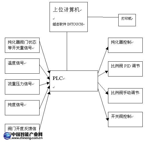 本高純氮設備由上下位機組成的電腦控制系統(tǒng)對整套裝置實施控制和管理。通過PLC控制柜編制控制程序,用它來處理運行整套裝置的所有輸入和輸出信號。個人電腦(PC)是PLC控制柜和操作員之間的人機界面,它里面安裝了人機交互軟件包INTOUCH組態(tài)軟件,電腦還連接打印機,可打印表格和圖形等。