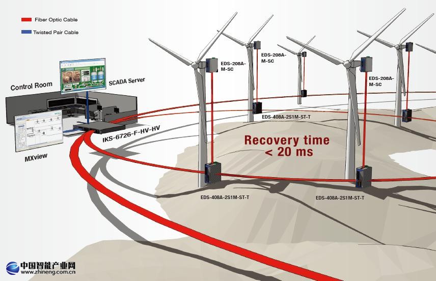 東方汽輪機廠(DSTW),一個中國汽輪機生產廠商,正在開發一個涉及到66 1.5 MV 風力發電機組的黑龍江風場項目。DSTW需要建立一個SCADA系統,幫助管理員從遠程監控現場設備和現場操作,同時記錄正在運行的操作數據用于即時分析。由于中國東北部的惡劣天氣條件,聯網設備必須極度強固才能進行可靠操作。DSTW發現Moxa的IKS-6726 機架式網管型工業以太網交換機和EDS-408A工業以太網交換機非常適合他們網絡基礎設施的特殊需求。