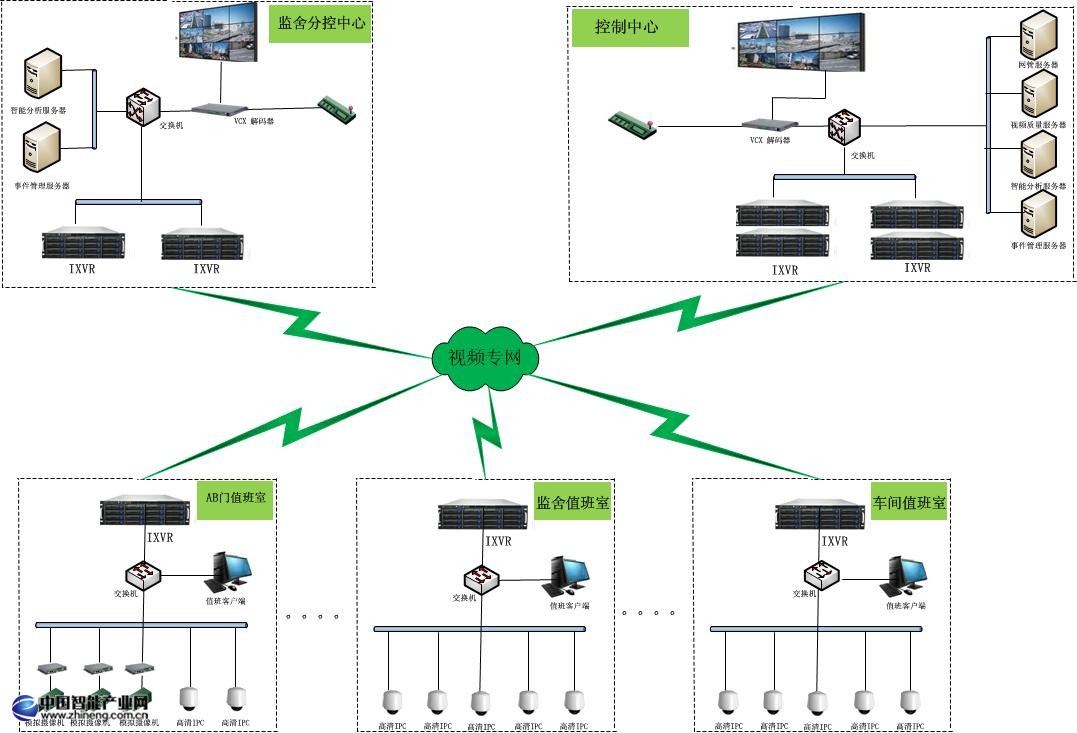 系統采用蛙視退出的IXVR分布式混合管理平臺,從監控中心、分控中心到監舍、AB門、車間分布式部署IXVR。對原有模擬系統進行無縫兼容,對新建高清網絡攝像機統一接入,實現分布式存儲,集中管理。并且加入事件管理服務器、視頻質量診斷服務器,無線發布服務器、網管服務器、視頻分析服務器,實現監獄安防系統智能應用、智能管理、系統聯動的需求。