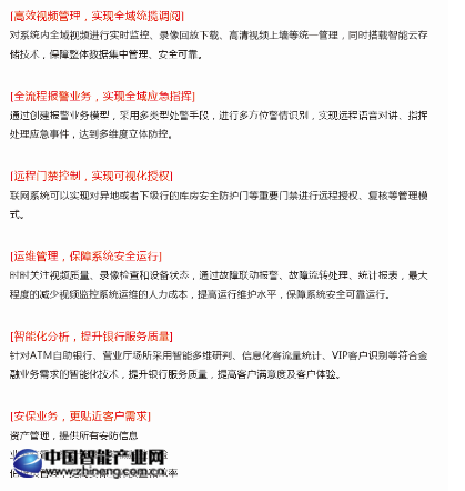 大華金融安防聯(lián)網(wǎng)解決方案以綜合管理平臺(tái)為核心,結(jié)合銀行機(jī)構(gòu)的特殊需求,一方面融合了視頻監(jiān)控、報(bào)警管理、門禁管理、對(duì)講管理、大屏顯示、環(huán)境監(jiān)控等多個(gè)子系統(tǒng);另一方面集網(wǎng)點(diǎn)客流量統(tǒng)計(jì)、VIP客戶服務(wù)、自助銀行語(yǔ)音求助、ATM智能化防范、防護(hù)艙管理、金庫(kù)遠(yuǎn)程授權(quán)、資產(chǎn)管理、智能運(yùn)維、業(yè)務(wù)監(jiān)督、交接班管理等銀行業(yè)務(wù)融于一體。為銀行用戶提供高性價(jià)比、高穩(wěn)定性、高擴(kuò)展性的整體方案。