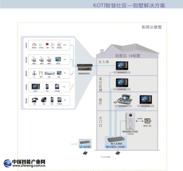 系統(tǒng)由數(shù)字室內(nèi)機(jī)、數(shù)字別墅小門口機(jī)、門禁相關(guān)設(shè)備、安防相關(guān)設(shè)備、KOTI智能家居設(shè)備、電腦/手機(jī)/PAD終端軟件等組成。