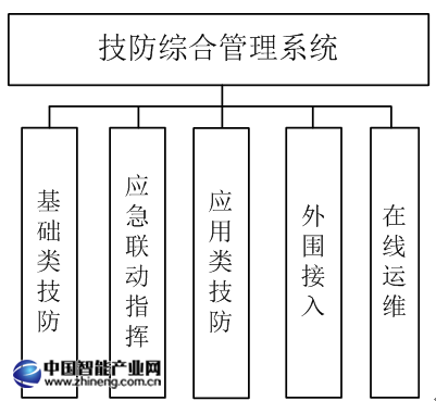 系統組成主要包括:基礎類技防、應急聯動指揮、應用類技防、外圍接入、在線運維五個部分。